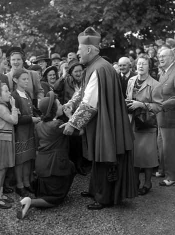 Uma mulher demonstra respeito ao Rev. Cushing em Boston, 1949