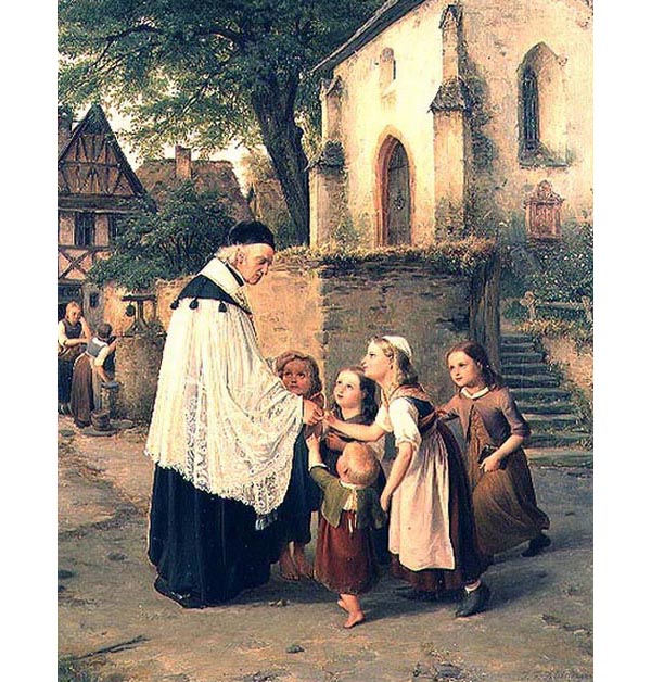 Um padre em uma vila no Reno está caminhando pela rua, talvez caminhando de volta para a casa paroquial depois de ouvir confissões na igreja. Várias crianças o vêem aproximar-se e vêm cumprimentá-lo, dar-lhe algum pequeno presente e receber sua bênção. Seus rostos, abertos e frescos, expressam seu prazer em o saudar. Ao mesmo tempo, nas fisionomias dos inocentes pequeninos encontra-se uma profunda admiração e respeito, quase veneração, por seu pastor.
