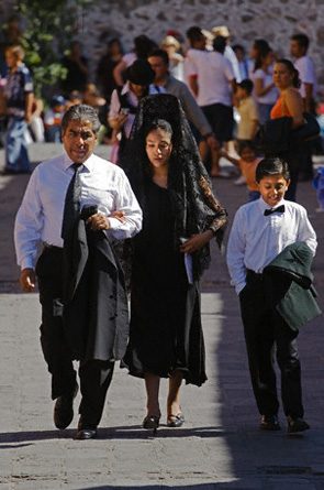 Uma família tradicional bem vestida indo a uma procissão para Nossa Senhora de Guadalupe |