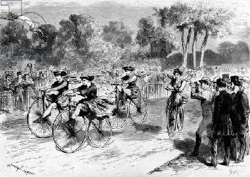 A primeira corrida de bicicleta feminina na França em um parque em Bordeaux, 1º de novembro de 1868