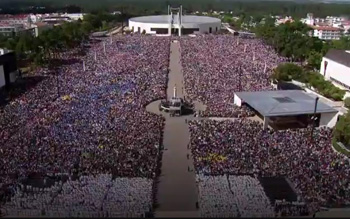 Um Cristo sem rosto paira sobre a multidão na praça de Fátima, símbolo da Igreja do Vaticano II