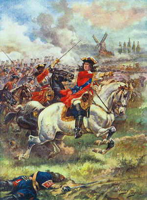 John Churchill lidera o exército inglês na batalha de Blenheim. Ele se tornou o duque de Marlborough |