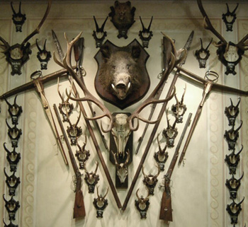 Acima, caça à raposa na França; abaixo, troféus no Kaiser Ville, em Bad Ischl, Áustria