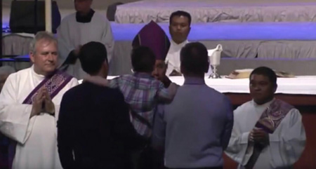 Um casal de homens do mesmo sexo e seu filho entregam presentes ao Altar – REC 2016