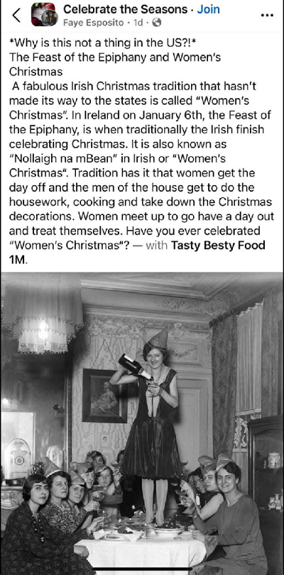 Recentemente, a TIA foi questionada sobre essa tradição irlandesa de um dia de folga para as mulheres, chamado Natal das Mulheres, na Festa da Epifania. Enviamos a pergunta para nossa apoiadora de confiança na Irlanda, Srta. C.M., para saber sua opinião. Abaixo você encontrará a pergunta e sua resposta.