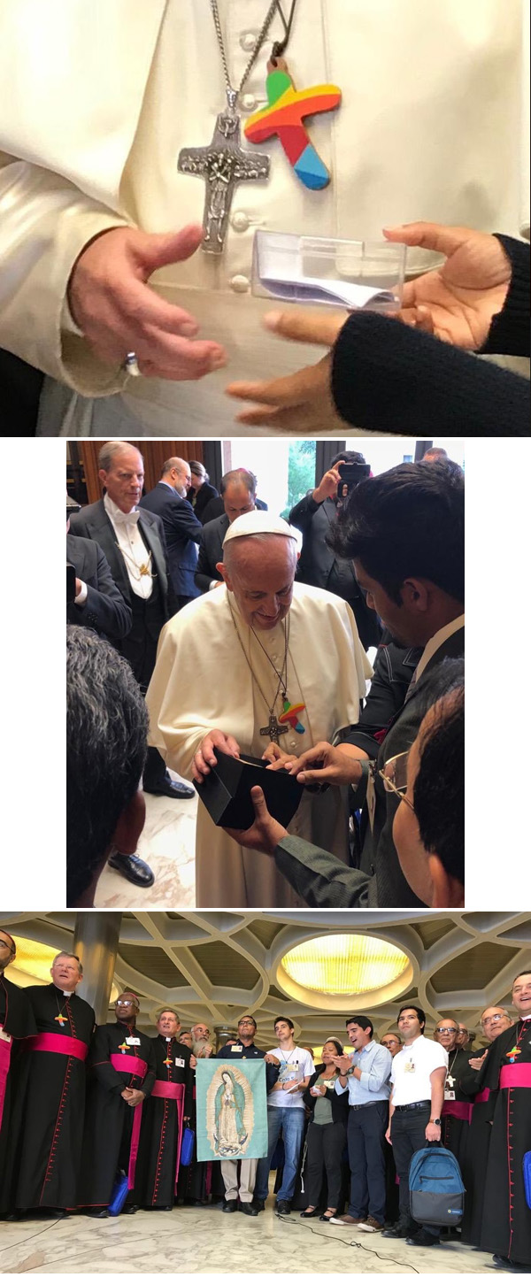 A 17 de outubro de 2018 no Sínodo da Juventude o Papa Francisco recebeu uma cruz pastoral com as cores do arco-iris e começou a usá-la imediatamente, acima, primeira e segunda filas abaixo. Seguindo seu exemplo, logo depois, muitos Bispos presentes ao evento também estavam usando cruzes similares, terceira fila.A cruz foi criada pela Conferência Episcopal Latino Americana, CELAM, para a Jornada Mundial da Juventude de 2019 que terá lugar no Panamá. Supostamente – como a CELAM pretende – cada cruz é símbolo de uma area diferente da América Latina e do seu eco-sistema.