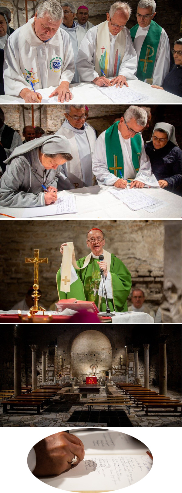 Nas fotos desta página, você vê Bispos e religiosos, assinando o segundo Pacto das Catacumbas exatamente no mesmo local em que o primeiro foi assinado, as Catacumbas de Santa Domitila, quarta fila abaixo.