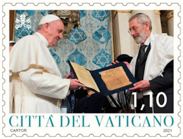 Acima, está uma reprodução do selo do Papa Francisco dando um códice ao rabino Riccardo di Segni na sinagoga de Roma em 17 de janeiro de 2016.O selo foi emitido em 22 de fevereiro de 2021, como o primeiro de uma série de quatro selos “inter-religiosos” para comemorar o 9º ano do Pontificado de Francisco.