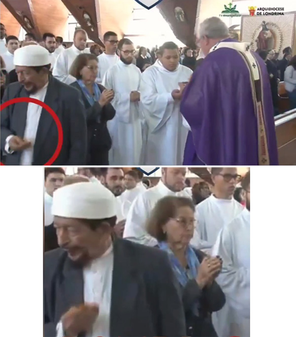 O Arcebispo de Londrina, no Brasil, entregou a Sagrada Comunhão nas mãos de um Xeique Muçulmano, como mostram as fotos desta página.Com efeito, numa missa fúnebre no dia 28 de agosto de 2023, o Arceb. Geremias Steinmetz deu o Sacramento da Eucaristia ao Xeique Saleh Mahairi, fundador de uma mesquita muçulmana em Londrina.