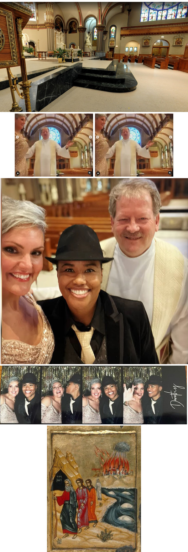 Além disso, se compararmos as fotos da segunda fila abaixo com as da terceira e quarta filas, vemos que a cerimônia foi realizada no presbitério da Igreja em frente ao altar do Novus Ordo, mesmo local onde são realizados os casamentos católicos regulares.