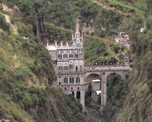Abaixo, a entrada do Santuário, que leva à caverna com a imagem milagrosa de Nossa Senhora de Las Lajas.