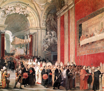 Mantendo a ordem hierárquica, o Papa Gregório XVI chega ao final de uma procissão na Basílica de São Pedro em Roma |