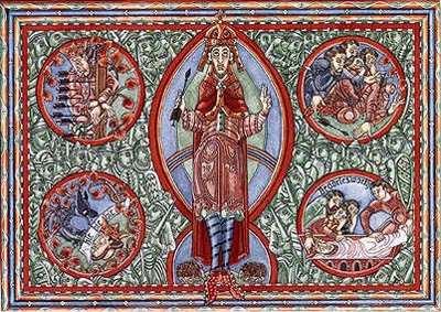 Cenas da vida do Rei Santo Edmundo. Em seu martírio (canto superior esquerdo) ele foi torturado e crivado de flechas antes de ser decapitado (canto superior direito) |