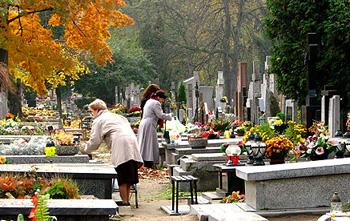 Preparando túmulos com velas votivas e flores; abaixo, o cemitério Rakowwicki de Cracóvia na véspera