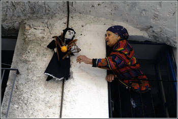 A 'velha sábia' com sua roca; abaixo, La Quaresima: uma pena é arrancada a cada semana da Quaresma