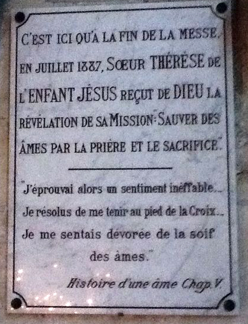 Placa na Catedral de Lisieux: neste local, em uma missa em julho de 1887, Irmã Teresa do Menino Jesus recebeu de Deus a revelação de sua missão: salvar almas através da oração e do sacrifício. “Senti um anseio inefável e resolvi me manter aos pés da Cruz. Fui devorada pela sede de almas.” (Autobiografia, cap. V)