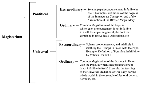 No Magistério Extraordinário, cada pronunciamento goza de infalibilidade por direito próprio. São definições solenes, como as da Imaculada Conceição, da Infalibilidade Papal e da Assunção da Bem-Aventurada Virgem Maria. Mas – como veremos mais tarde – nem tudo que os Papas, Concílios e Bispos ensinam é infalível. O Magistério é chamado “ordinário” nos casos em que não estão reunidas as condições necessárias para que uma afirmação seja infalível em si mesma. Tanto o Magistério Papal como o Magistério Universal podem ser Ordinários ou Extraordinários. Temos, portanto, quatro formas diferentes de ensino na Santa Igreja (ver diagrama abaixo).