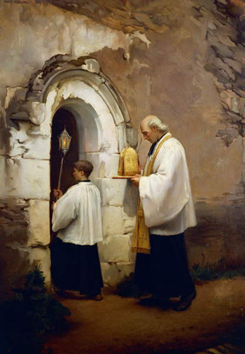 Antigamente, quando o sacerdote levava o Santíssimo Sacramento a um moribundo, ele usava sobrepeliz e estola e era acompanhado por um atendente que carregava uma lanterna e tocava uma campainha para anunciar a presença do Santo dos Santos. Ao ouvir o toque do sino, o povo parava o que estava fazendo para se ajoelhar e prestar reverência a Nosso Senhor na Hóstia.